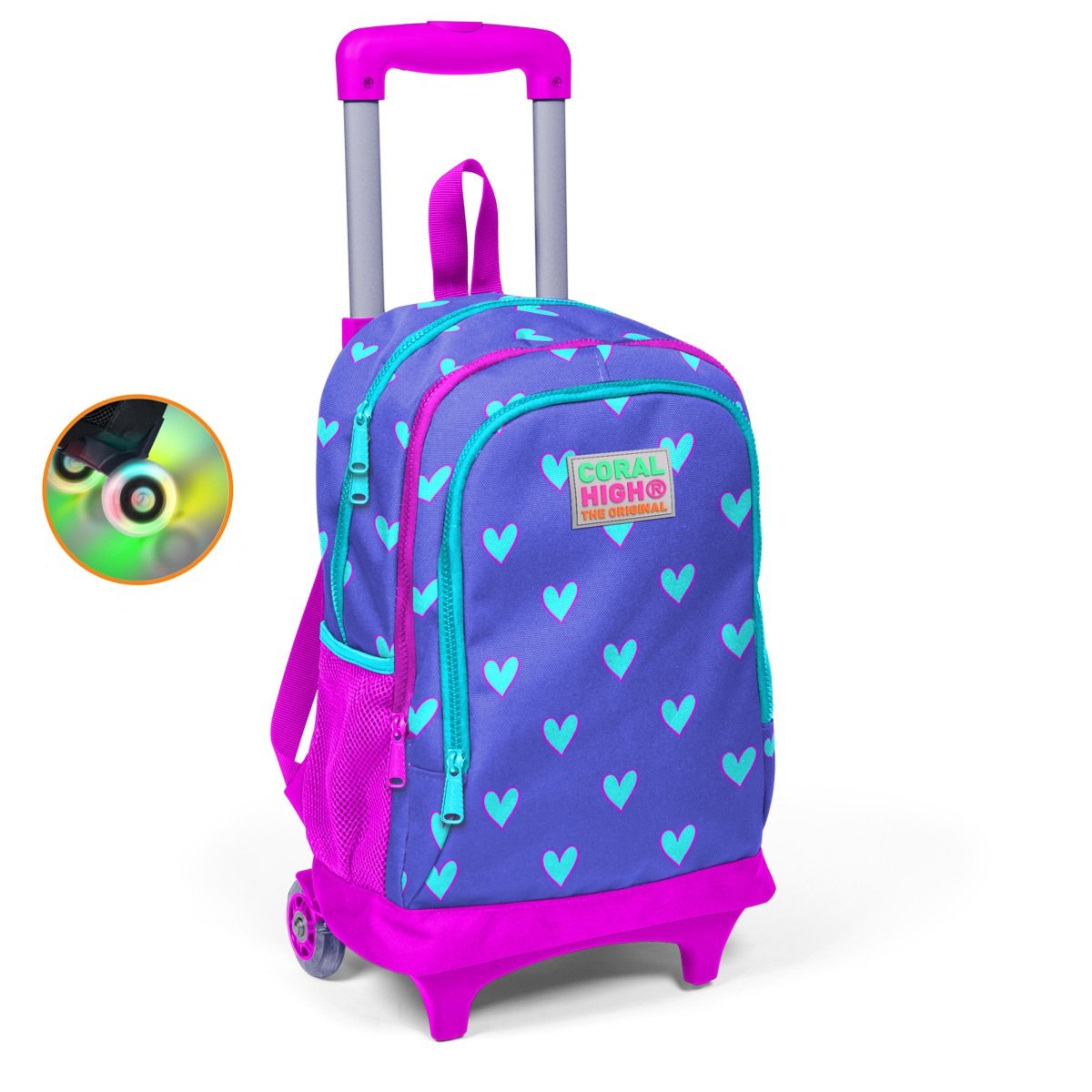 Profită reduceri și preț mic la Ghiozdan tip troller cu 3 compartimente, Coral High, mov cu inimioare bleu, numai la Noriel.