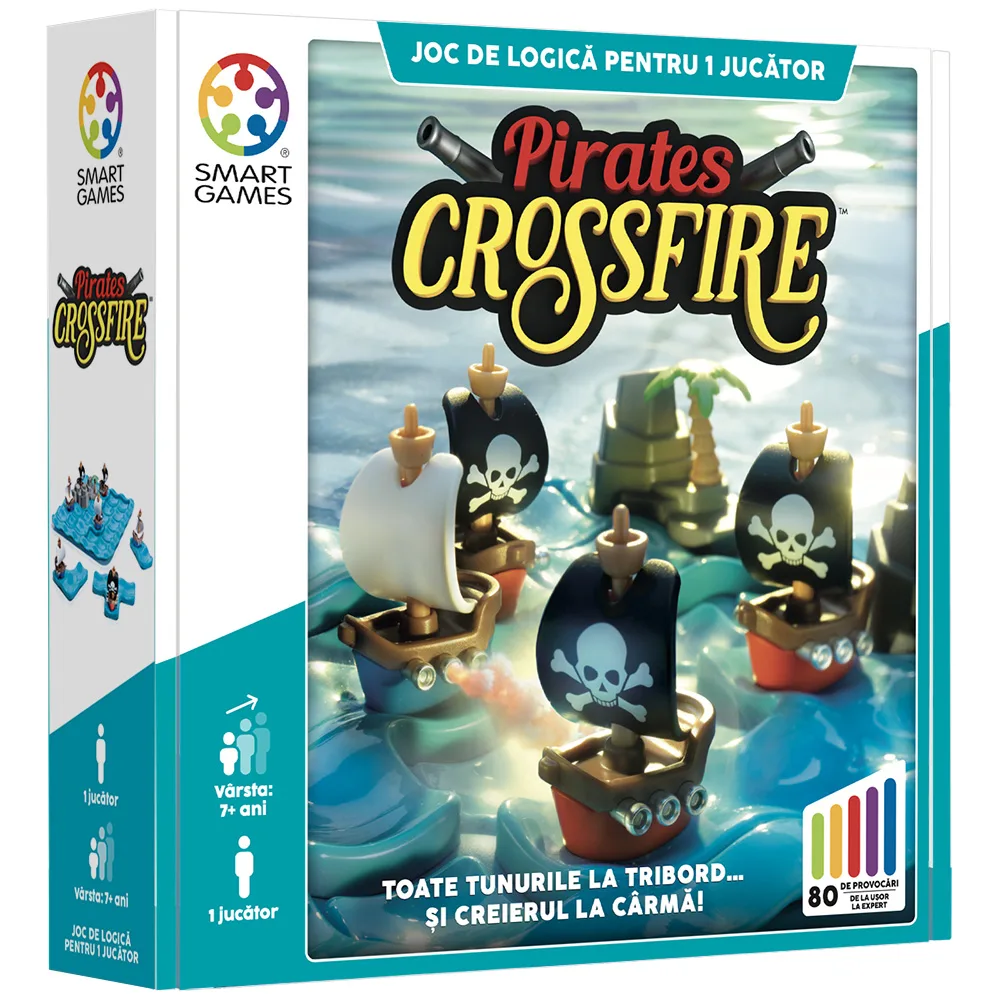 Pirates Crossfire este un joc pentru copii din seria Smart Games cu elemente de inalta calitate. Jocul include 80 de provocari logice cu dificultati crescatoare. Pregateste-ti tunurile si mintea pentru marea batalie! Poti sa-ti conduci flota prin marile periculoase, pline de pirati, pentru a aduce inamicul in bataia tunurilor tale si a-i scufunda navele? Sau vei pastra pacea si vei evita razboiul total? Pachetul contine: 1 tabla de joc reprezentand marea, 2 piese de joc cu stanci, 2 piese de puzzle cu nave negre (piratii), 4 piese de puzzle cu nave albe (marina) si 1 brosura cu 80 de provocari si solutii. Smart Games este lider mondial in producerea jocurilor de logica de peste 30 de ani. Creeaza jocuri logice, unice si inovative, cu tematici pe placul copiilor dar care se potrivesc pentru toate varstele. Principalele caracteristici ale jocurilor Smart Games includ:- Diversitate: ofera o gama variata de jocuri si puzzle-uri pentru toate varstele si nivelurile de abilitate. Acestea includ jocuri de logica, jocuri de strategie, puzzle-uri tridimensionale cu miniaturi pe placul copiilor.- Stimularea gandirii logice: sunt proiectate pentru a incuraja gandirea strategica, analitica si critica. Ele pun la incercare abilitatile jucatorilor in rezolvarea de probleme si in identificarea unor solutii eficiente.- Adaptabilitate: Multe dintre jocuri sunt concepute pentru a fi portabile si compacte, ceea ce le face potrivite pentru a fi jucate in timpul calatoriilor sau in orice alta ocazie. Ele sunt, de asemenea, adaptate pentru a fi jucate atat de copii, cat si de adulti.- Reutilizabilitate: Majoritatea jocurilor Smart Games sunt realizate din materiale durabile si pot fi rejucate de mai multe ori. Ele ofera mereu noi provocari si posibilitati de invatare, facandu-le potrivite pentru utilizare pe termen lung.