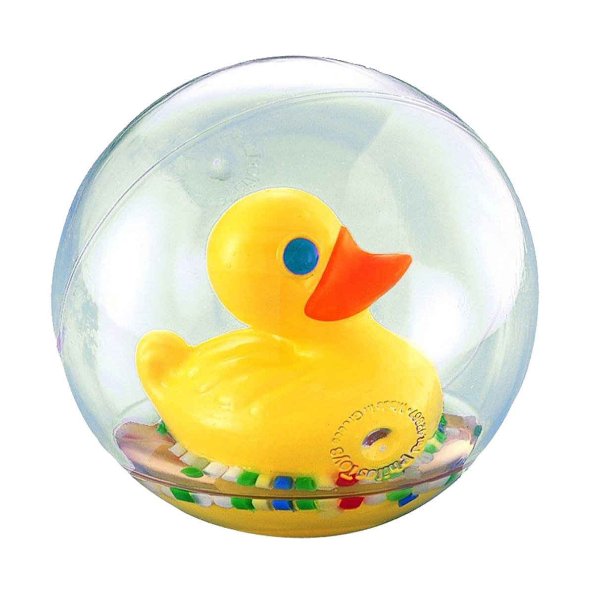 Mac, mac, mac! O ratusca vesela pluteste intr-o minge mare de plastic transparenta, in timp ce aceasta se rostogoleste, incurajand bebelusul sa o loveasca si o rostogoleasca si apoi sa mearga de-a busilea dupa ea ca sa o prinda! Are marimea perfecta pentru manutele bebelusilor ca sa o poata apuca si scutura – avand si confeti colorate care se invartejesc inauntru. Caracteristici: Minge transparenta de plastic, cu o ratusca prietenoasa si vesela, plutind inauntru Mersul de-a busilea dupa minge ajuta bebelusul sa-si dezvolte capacitatea motorie