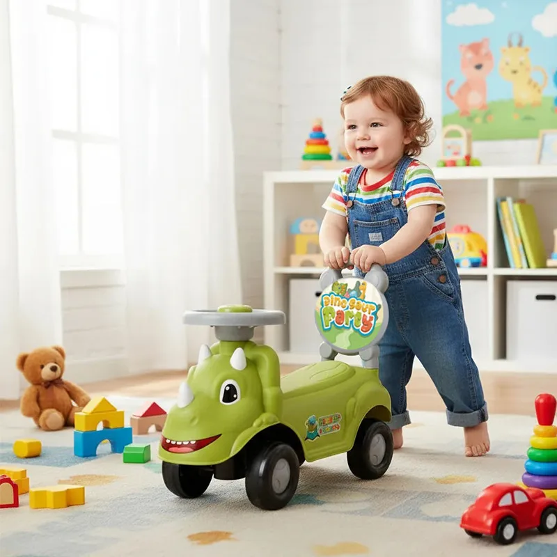 Profită reduceri și preț mic la Masinuta fara pedale, model dinozaur verde, volan muzical, 50×21.5×33 cm, numai la Nichiduta.