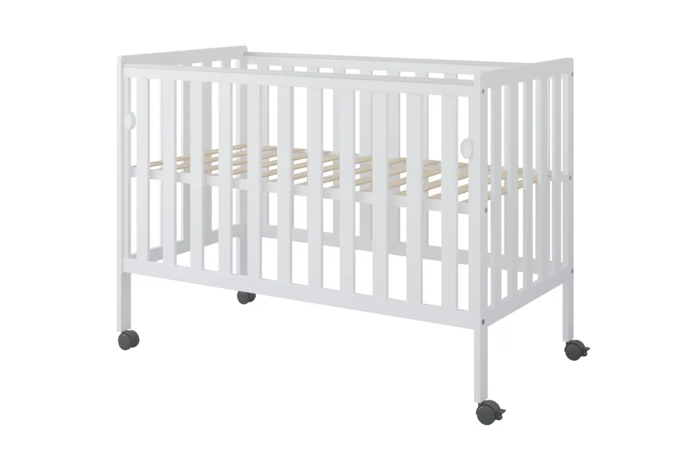 Comandă Patut din lemn si MDF pentru copii Nichiduta Bambi Alb cu laterala culisanta,roti cu blocare, vopsele ecologice pe baza de apa, margini rotunjite, dimensiuni interioare 120×60 cm de la Nichiduta.