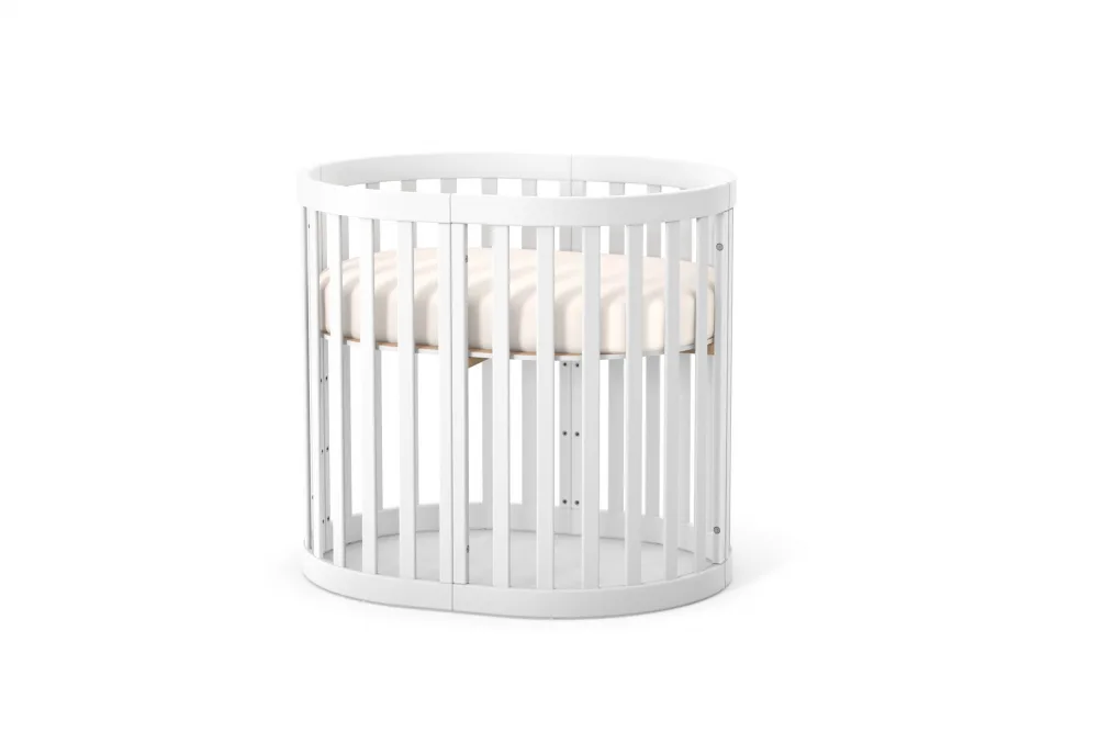 Patut oval pentru copii 90×70 cm LD14 Alb din lemn masiv de fag, 0-12 luni, saltea inclusa, cu posibilitate de extensie, inaltimea saltelei reglabila