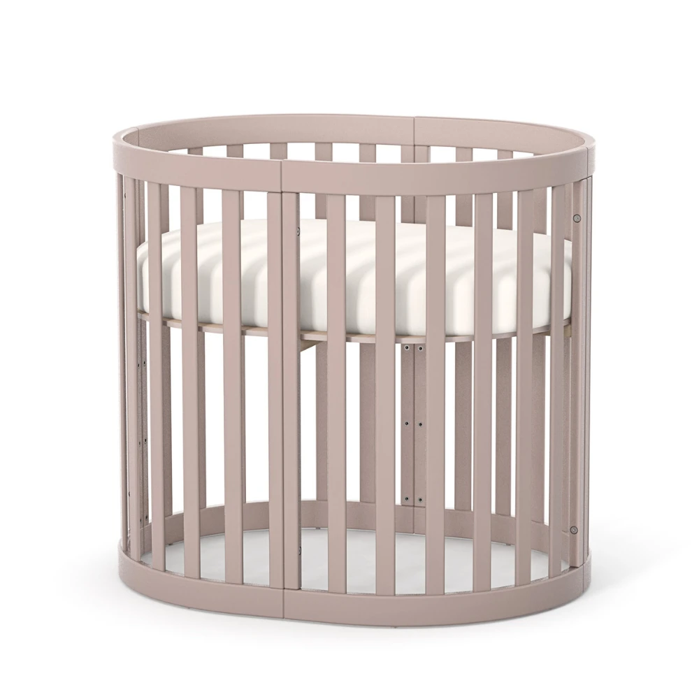 Patut oval pentru copii 90×70 cm LD14 Bej din lemn masiv de fag, 0-12 luni, saltea inclusa, cu posibilitate de extensie, inaltimea saltelei reglabila