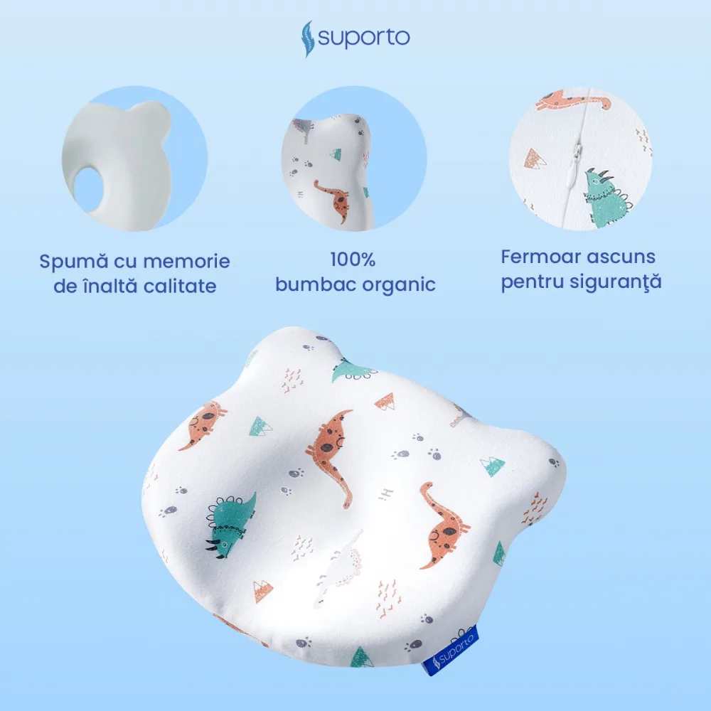 Profită reduceri și preț mic la Perna pentru formarea capului Suporto Alb Ursulet model cu dinozauri, 0-12 luni, impotriva plagiocefaliei, ortopedica si hipoalergenica, din spuma cu memorie, husa din bumbac, numai la Nichiduta.
