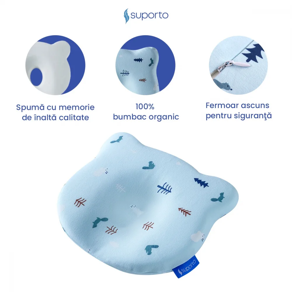 Comandă Perna pentru formarea capului Suporto Albastru Ursulet, 0-12 luni, impotriva plagiocefaliei, ortopedica si hipoalergenica, din spuma cu memorie, husa din bumbac de la Nichiduta.