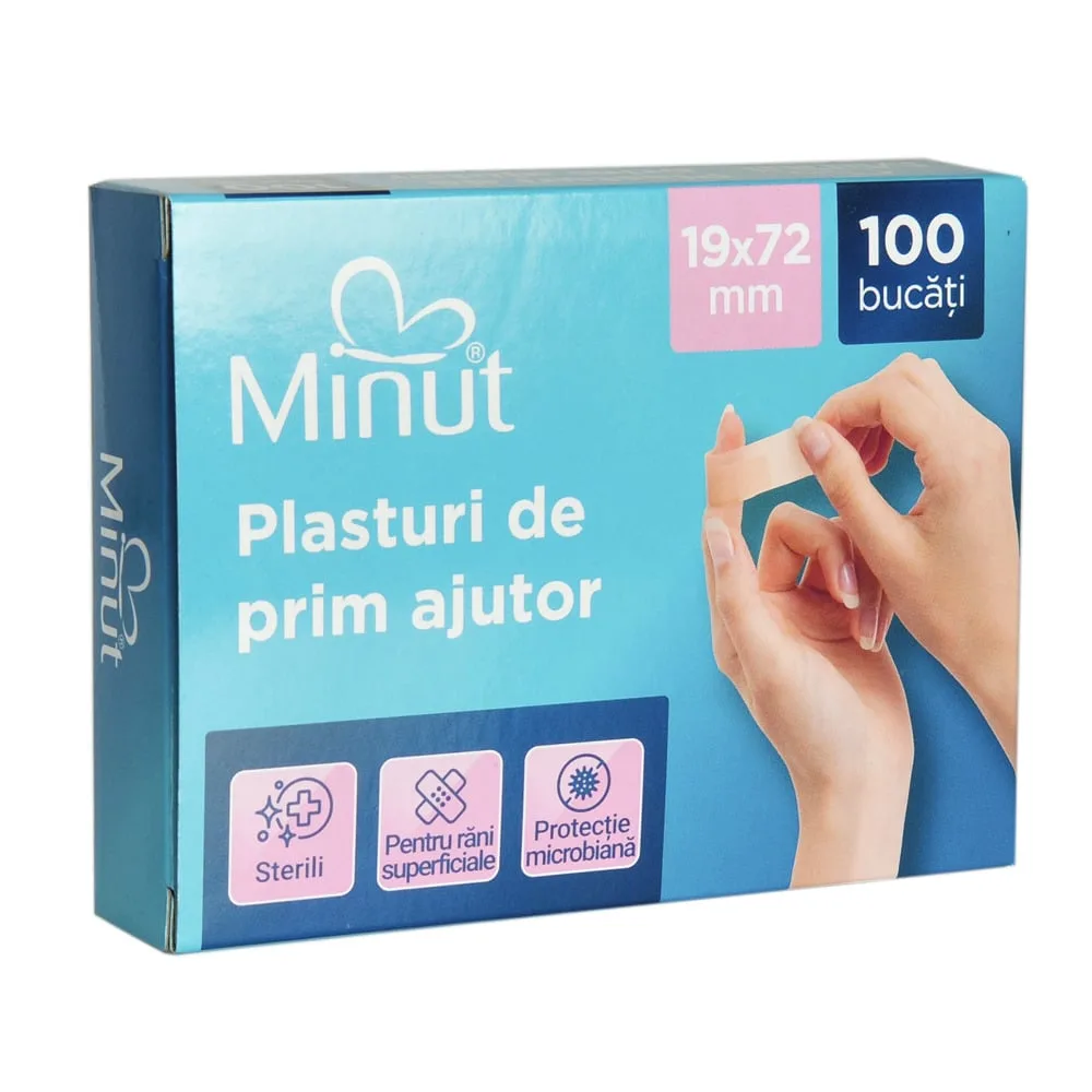 Plasturi pentru Prim Ajutor Minut , 100 bucati (1.9 x 7.2 cm)Plasturii Minut sunt ideali pentru ingrijirea rapida a ranilor minore si zgarieturilor.Pansamentul contine antiseptic, oferind protectie mi