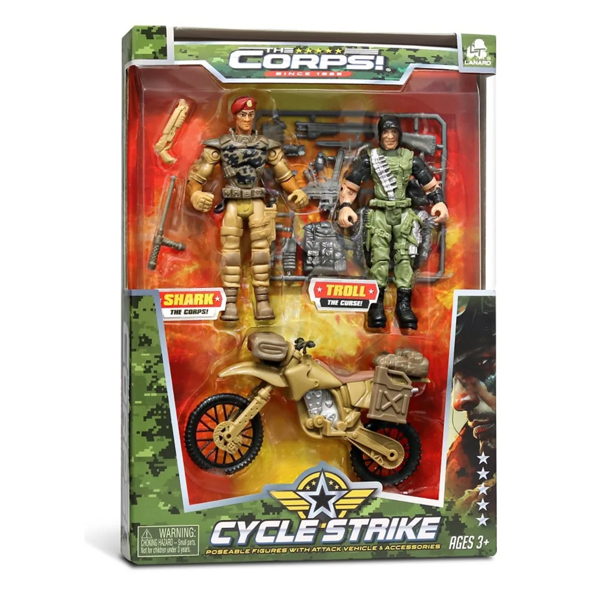Acest set din gama The Corps! Cycle Strike iti ofera tot ce ai nevoie pentru confruntari spectaculoase pe teren dificil. Pachetul include 2 figurine articulabile extrem de detaliate, pregatite sa faca fata oricarei provocari, alaturi de vehiculul militar de atac Shark-Troll, conceput pentru interventii rapide si misiuni strategice. Figurinele sunt complet echipate pentru misiuni tactice, iar vehiculul adauga un plus de intensitate fiecarei confruntari imaginare. Ideal pentru copiii pasionati de aventuri militare, strategie si jocuri de rol pline de actiune. Inaltime figurina: 10 cm Setul contine:- 2x figurine soldat;- 1x vehicul militar;- diverse arme.