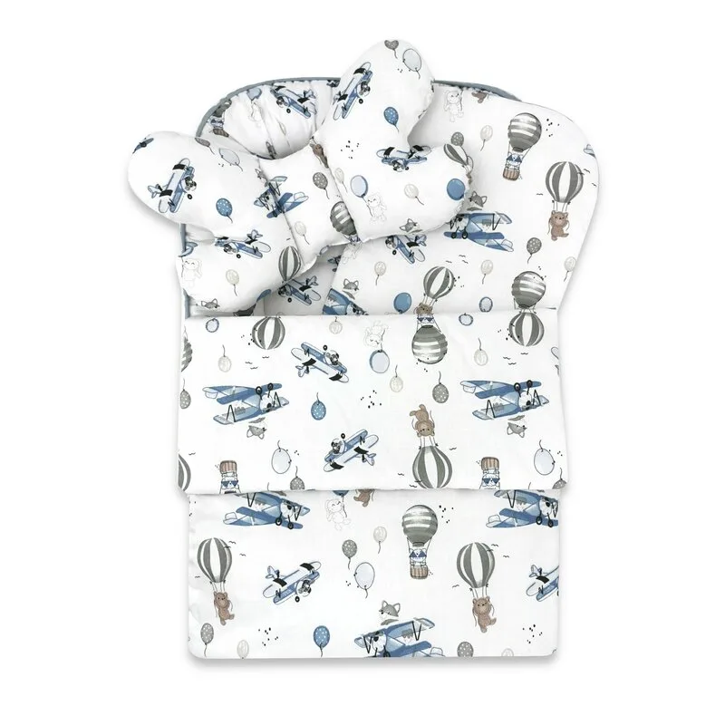 Set Baby Cocoon 4 piese ndash MimiNu Colectia Blue PlanePentru bebelusi 0-6 luni Bumbac 100 certificat Oeko-Tex Fabricat manual in PoloniaUn set multifunctional, complet si confortabil, perfect pen