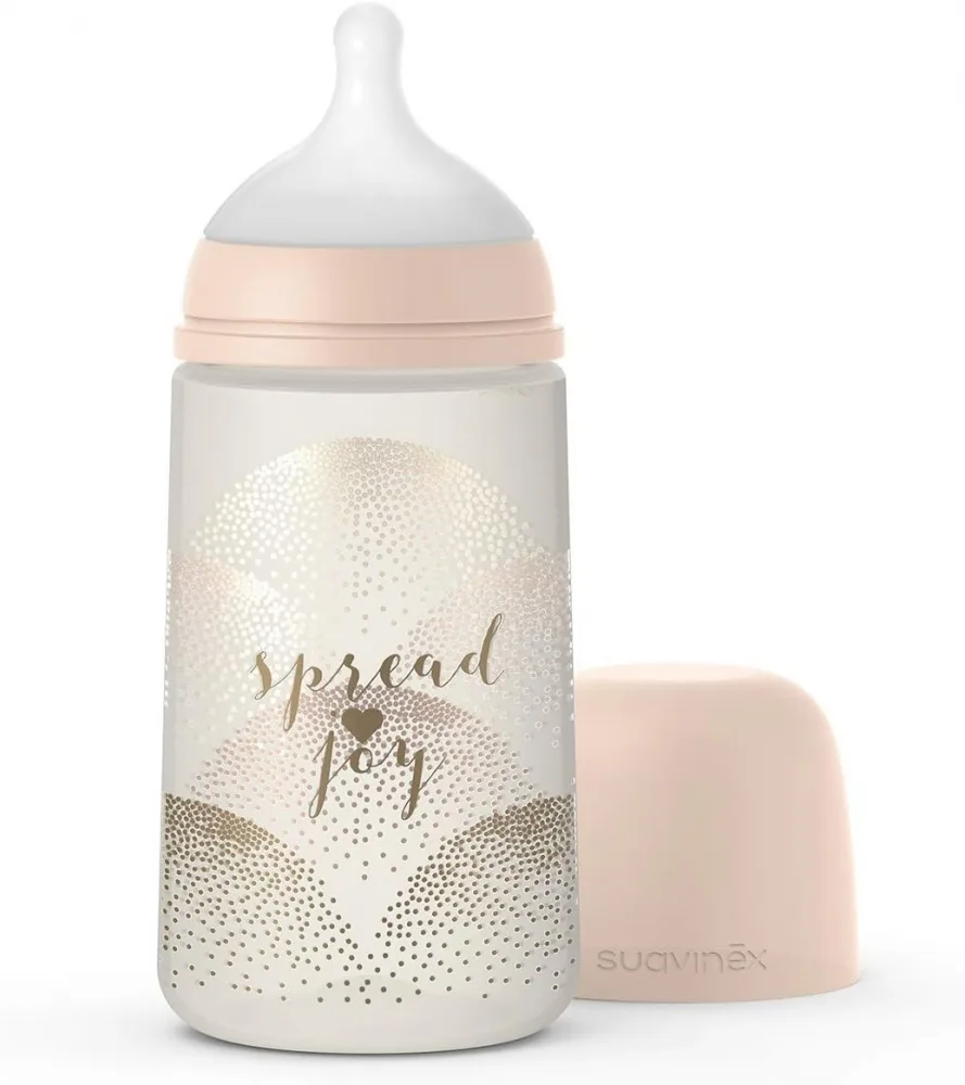 Set biberon 270 ml cu tetina SX Pro cu debit mediu + suzeta SX Pro + clema pentru suzeta Spread Joy bej Suavinex