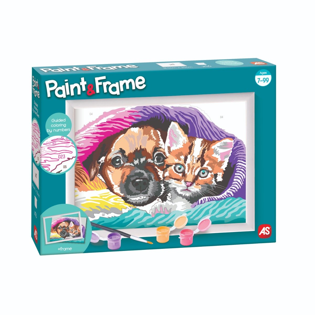 Cu seturile Paint & Frame, bazate pe tehnica de colorare pe numere, copiii invata sa coloreze diferitele imagini cu atentie si grija, imbunatatindu-si astfel talentul artistic si dezvoltandu-si abilitatile motorii. In final, vor avea un sentiment de bucurie, mandrie si satisfactie care ii va stimula sa vrea sa continue sa picteze. Satisfactie si bucurie! Transforma-te in artist si mandreste-te cu capodopera ta. Paint & Frame transforma pe oricine intr-un adevarat artist! Imaginile colorate cu rame incluse sunt perfecte pentru camerele copiilor Setul include:- 16x culori acrilice gata de utilizare- 1x paleta- 1x cartonas preimprimat- 1x pensula- 1x rama- 1x manual