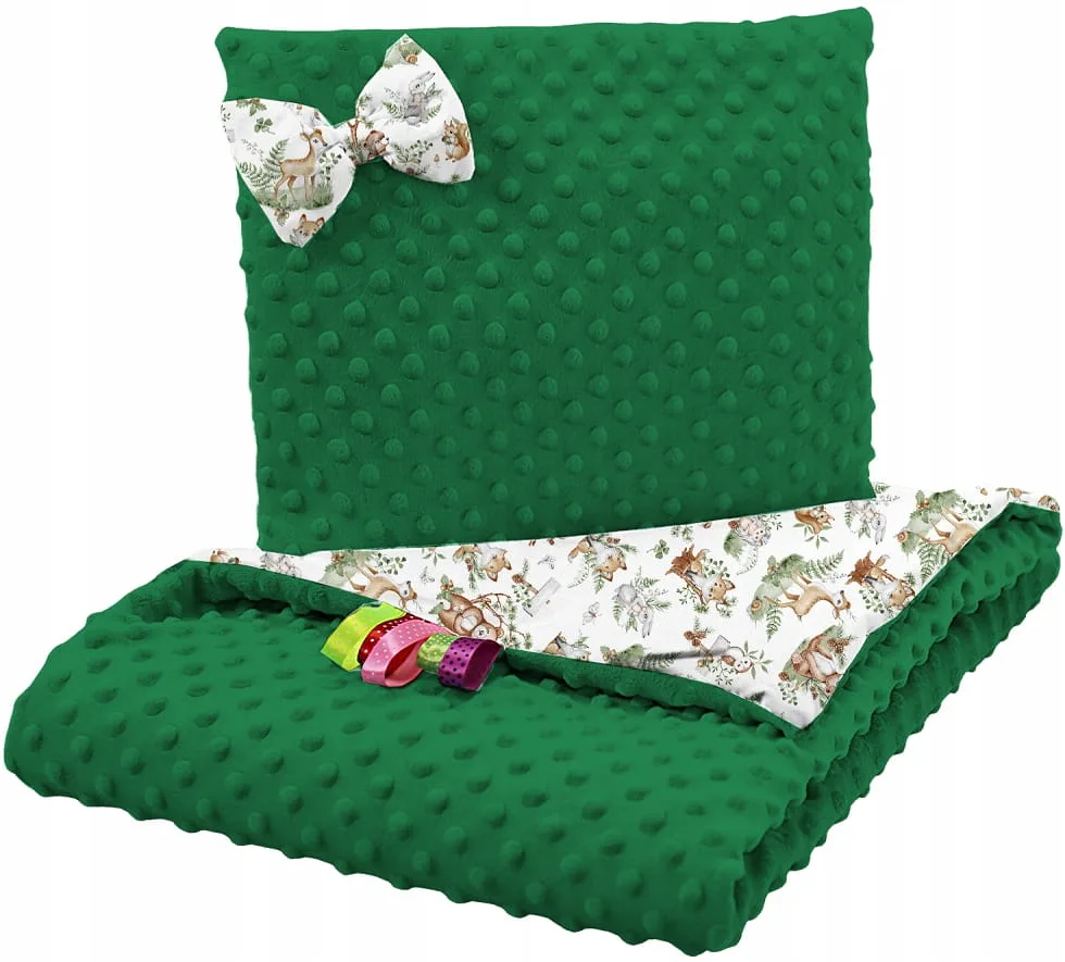 Set paturica 75×100 cm si perna 35×30 cm pentru copii, BabyMam minky green forest, versatila cu doua fete