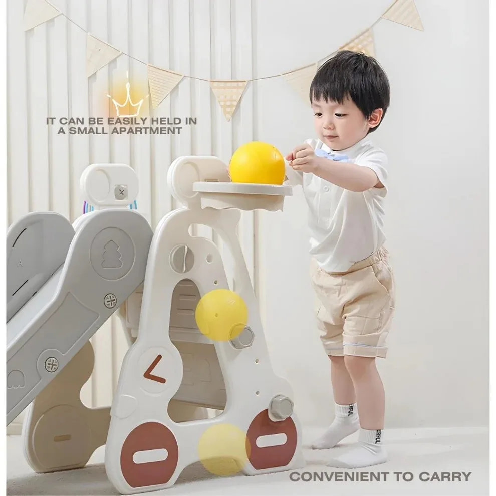 Profită reduceri și preț mic la Tobogan pentru copii Nichiduta Garden Grey Car, de interiorexterior cu mini-cos de Baschet si joc de precizie cu inele, cu scara, manere de sustinere, design pliabil, 38 x 155 x 70cm, numai la Nichiduta.
