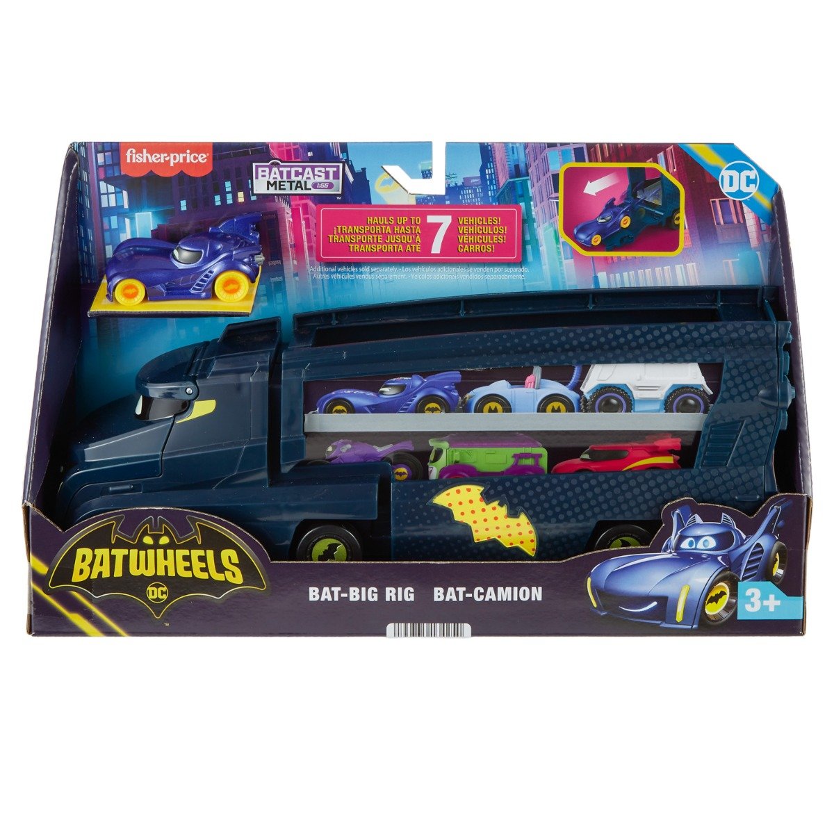 Acest transportor impresionant ofera spatiu de depozitare pentru pana la sapte vehicule la scara 1:55. Deschide usa din spate pentru a incarca si descarca masinile, apoi trimite-l pe Batman in actiune! Inspirat din seria Batman de la DC, port-masina Bat-Big Rig de la Fisher-Price le permite copiilor sa retraiasca momentele lor preferate. Transportorul dispune de o parte laterala, o cabina frontala si o rampa spate care se deschid pentru o experienta de joc plina de aventura! Pachetul contine:- 1x transportator;- 1x masina Bam the Batmobile.