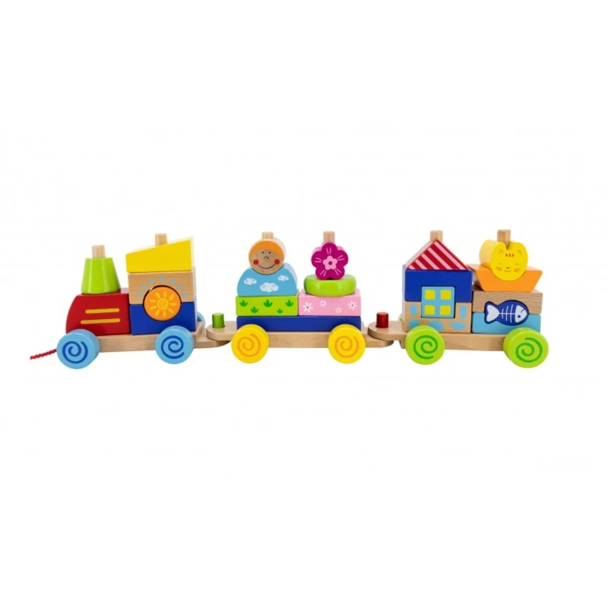 Locomotiva si cele doua vagoane ale trenuletului modular pot fi construite in mai multe feluri, stimuland astfel creativitatea micutului. Copilul poate trage sau impinge acest trenulet. Jucaria contine 26 de cuburi din lemn care creeaza un trenulet vesel colorat. Partile care leaga vagoanele sunt atent construite pentru a asigura o durabilitate cat mai mare a jucariei. Jucaria este destinata copiilor cu varsta peste 18 luni. Functii: stimuleaza dezvoltarea motorie si senzoriala, coordonarea mana-ochi. Dimensiuni produs in ambalaj: 38 x 7.5 x 9.5 cmDimensiuni produs: 46.5 x 8 x 12 cmGreutate produs: 1 kgVarsta recomandata: 18 luni +